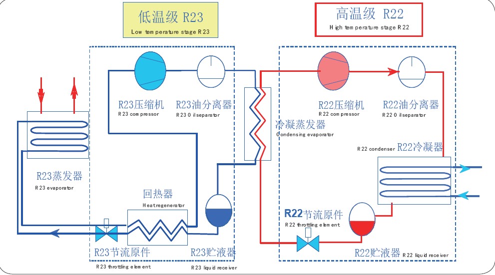 隨著制冷系統(tǒng)的應(yīng)用范圍越來越廣,要求達(dá)到的蒸發(fā)溫度也越來越低。當(dāng)所需的蒸發(fā)溫度低到一定程度時,采用單一制冷劑的兩級壓縮循環(huán)就會受到限制。復(fù)疊式制冷循環(huán)由于采用了低溫和中溫兩種不同的制冷劑,很好地解決了上述矛盾。